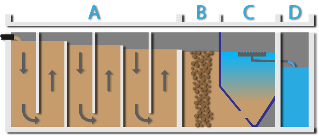A - Labirynt przepływu pionowego B - Strefa napowietrzania C - Strefa aktywnego osadu D - końcowe czyszczenie